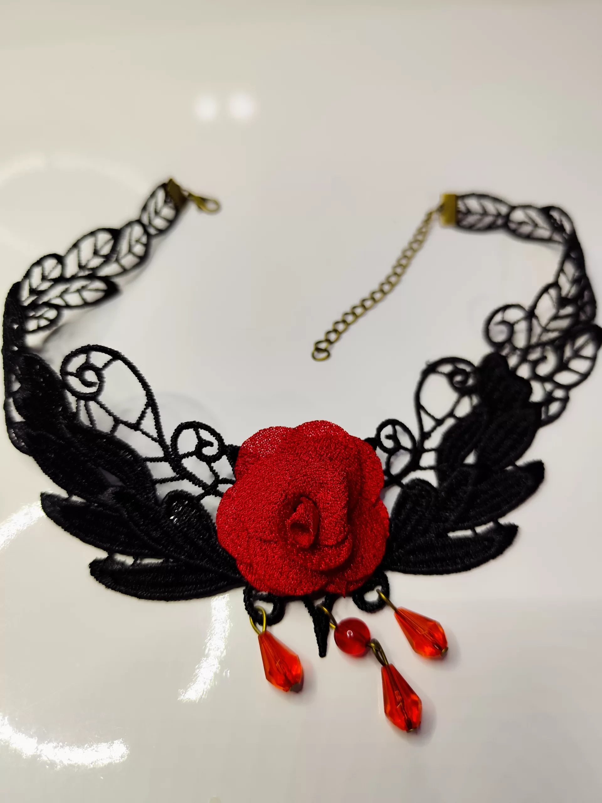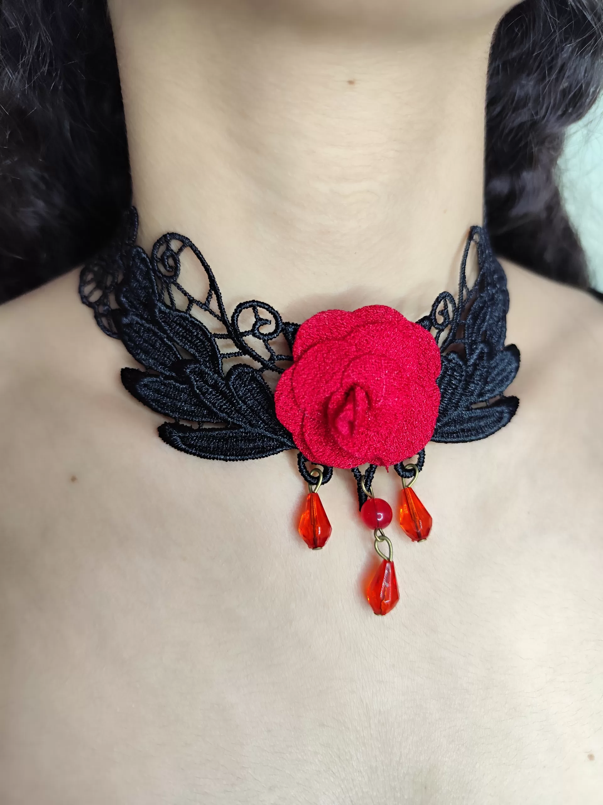 Lindo colar tipo choker todo em renda e aplicação de rosa vermelha e pingentes em pedras acrílicas.