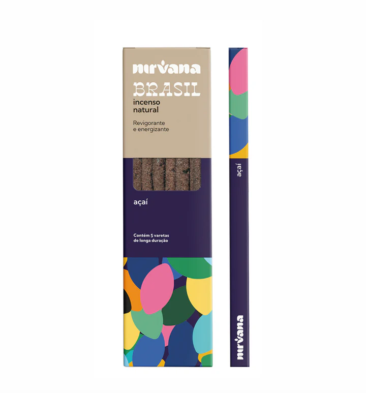 | Composição | Blend terapêutico Nirvana (mix de resinas naturais, ervas, óleos essenciais e especiarias), varetas de bambu, pó de madeira, aglutinante, essência, açaí in natura em pó. |