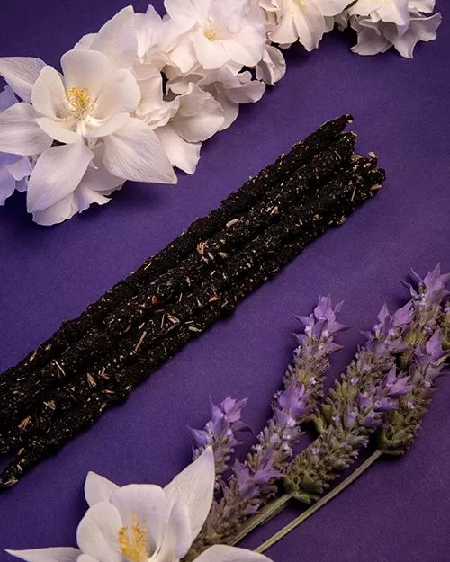 | Composição | Olibano, Flores de Lavanda, Óleo concentrado de flor de rainha da noite, biomassa de frutas, carvão vegetal, aglutinante natural e sal. |
