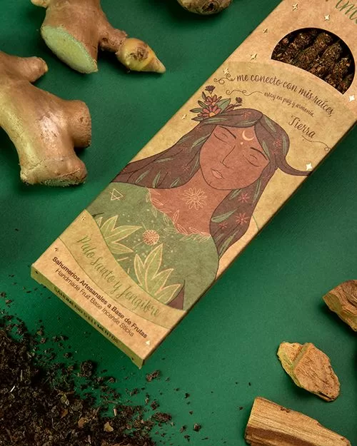 | Composição | Palo Santo, óleo concentrado de gengibre, biomassa de frutas, carvão vegetal, aglutinante natural e sal. |