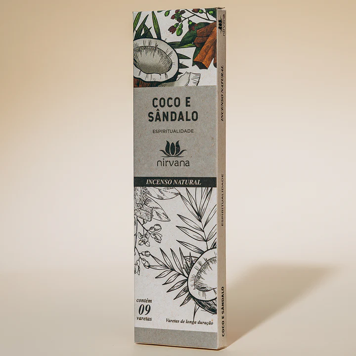 | Composição | Blend terapêutico Nirvana (mix de resinas naturais, ervas, óleos essenciais e especiarias), varetas de bambu, pó de madeira, aglutinante, fragrância de coco e sândalo. |