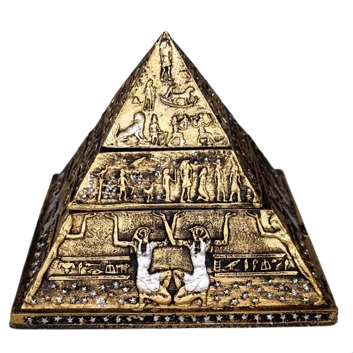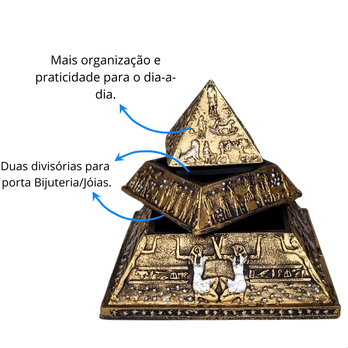 Além de ser um item decorativo a pirâmide com 3 divisórias serve como um porta joias ou objetos pequenos.